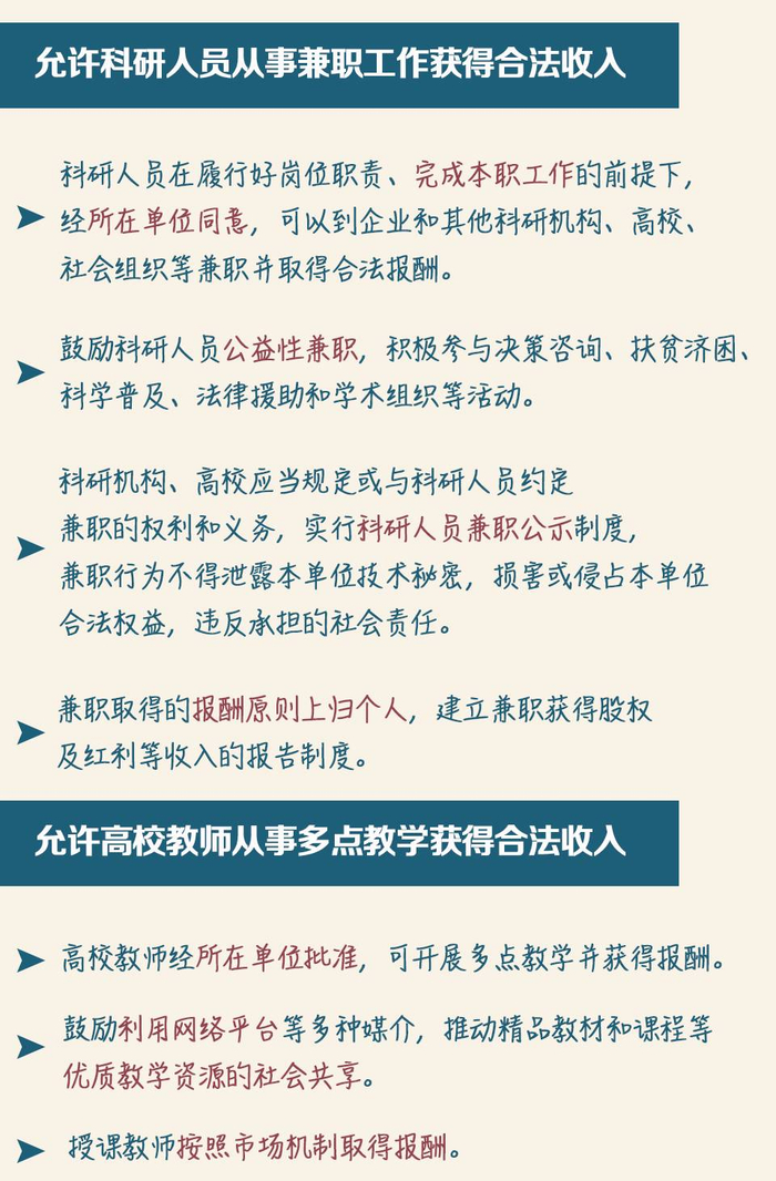 近日,中共中央办公厅、国务院办公厅印发《关于实行以增加知识价值为导向分配政策的若干意见》。《意见》指出,允许科研人员和教师依法依规适度兼职兼薪,包括允许科研人员从事兼职工作获得合法收入和允许高校教师从事多点教学获得合法收入。
