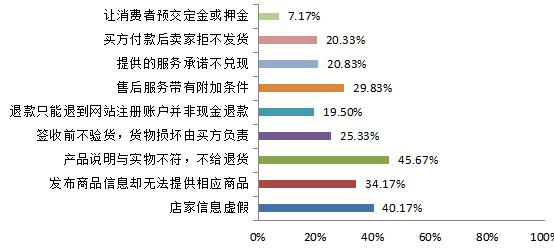 调查问卷在购买时遇到过的问题中设定了“店家信息虚假”“发布商品信息却无法提供相应商品”“产品说明与实物不符,不退货”“签收前不验货,货物损坏由买方负责”“退款只能退到网站帐户”“售后服务有附加条件”“提供服务承诺不兑现”“付款后拒不发货”“让消费者预交定金或押金”九个选项。
