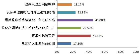 在退货时遇到问题中设定了“退款只退到网站帐户”“以各种理由拖延逃避7日时限”“退货程序或手续繁杂,举证成本高”“收取高额折旧”“要求外包装完好”“随意扩大拒退商品范围”6个选项。