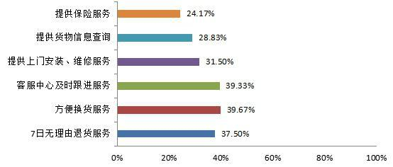 在最希望网购平台加强的服务中,设定了“提供保险服务”、“提供货物查询”、“提供上门安装、维修服务”、“客服中心及时跟进服务”、“方便换货服务”、“7日无理由退货服务”6个选项。