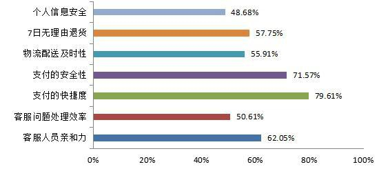 结果显示,“支付的快捷度”的满意度最高,为79,61%;“个人信息安全”、“客服问题处理效率”、“物流配送及时性”三项满意度较低,分别是48.68%、50.61%和55.91%(见图1)。