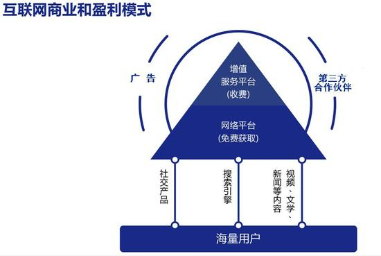 这张图反映的是互联网企业以双边市场(Two-sided Market)为核心特征的商业和盈利模式。通俗来讲,我们可以把平台理解为一个用户的蓄水池,所有互联网公司都在开足马力,试图用自己的服务把用户努力抽到自己的平台上,可能腾讯用的是社交,阿里用的是电商,百度用的是搜索,滴滴用的是出行等等,但本质上都希望能够通过免费服务方式将用户吸引到自己的平台上,并且能够使用户尽量长时间的停留,然后再在这个基础上产生商业模式。