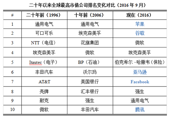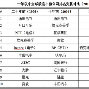 首先我们来看一张二十年以来全球最高市值公司排名情况变迁的表格。