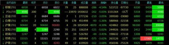 急忙一看,惊天巨变,自选合约竟然满屏跌停!最不可思议的棉花,直接从涨停砸到跌停。(图最后两栏的红色背景框,表示涨停价,绿色背景框,表示跌停价)