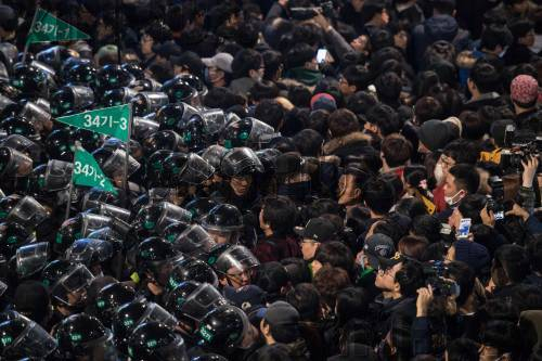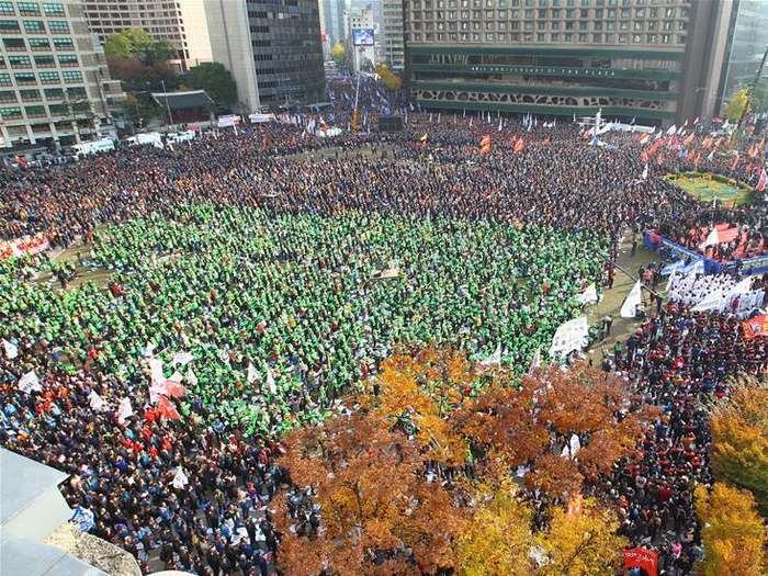 11月12日,数十万韩国民众在首尔市中心举行大规模集会,要求朴槿惠总统对“亲信干政”事件负责并立即下台。