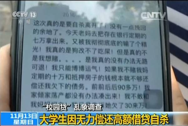 今年10月上旬,广西南宁的大学生小陆以做生意为名,向同学借款160多万元,却因赌博有90万元无力偿还,留下遗书自杀,这也引发了社会对校园贷的再次关注。