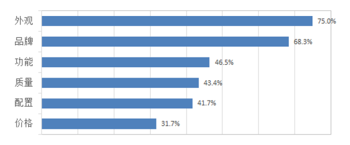 根据消费者的讨论情况,《报告》将消费者的关注维度划分为品牌、配置、功能、质量、外观、价格等。其中,消费者最关注的是外观,占比为75%,其次是品牌、功能和质量,排在最后的是配置和价格。