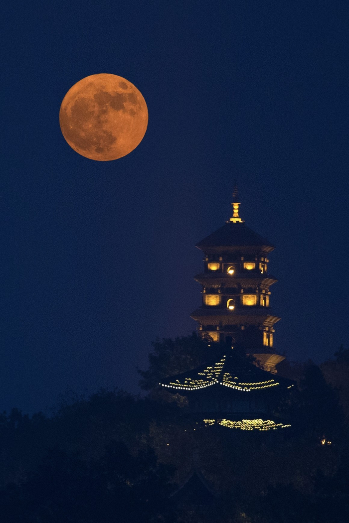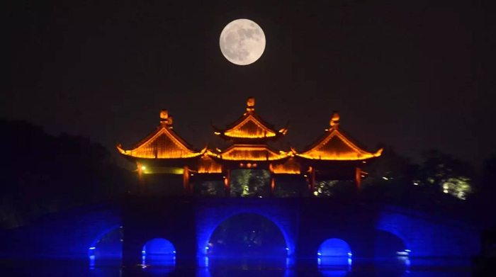 在江苏省扬州市,“超级月亮”和扬州瘦西湖五亭桥相映成趣。