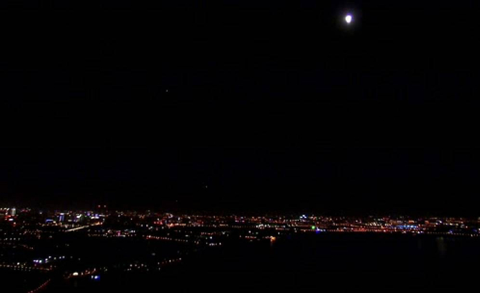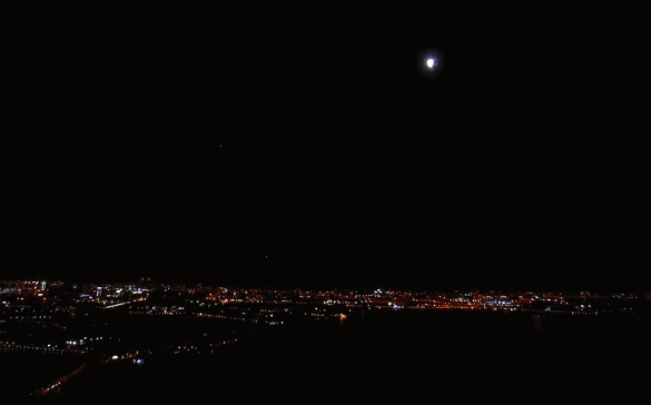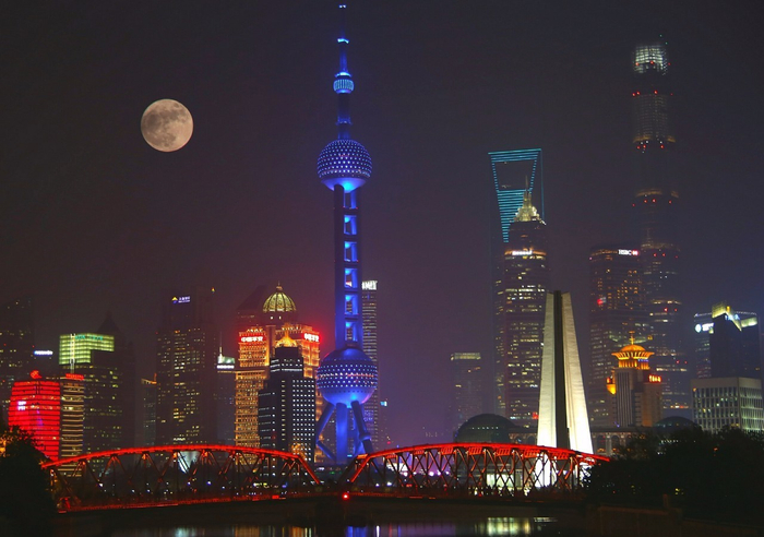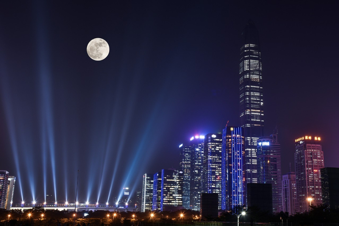 “超级月亮”照亮深圳的夜空,与深圳的灯光建筑相互辉映。