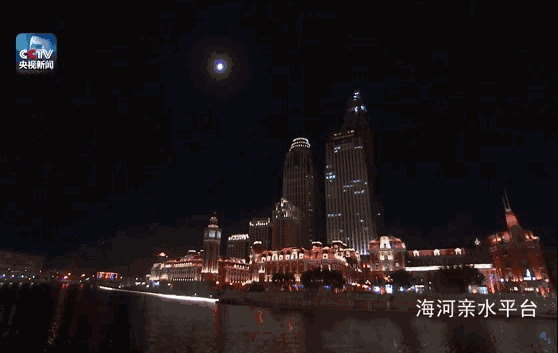 天津津湾广场,超级月亮圆润饱满,如美玉一般晶莹剔透。