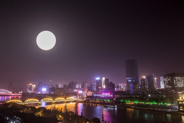 在宁夏银川滨河黄河大桥和黄河楼的“超级月亮”。