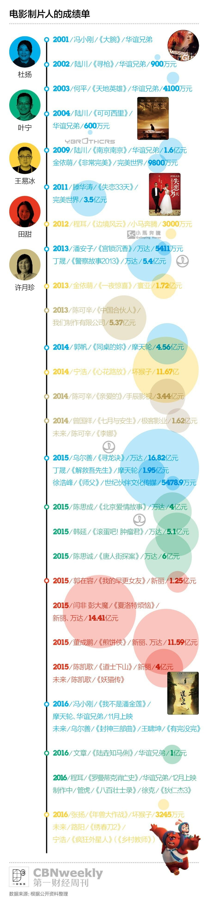 尽管电影市场越做越大,但市场中很大一部份作品都来自这个不超过10个制片人的核心圈子。杜扬所在的北京文化旗下的摩天轮厂牌,最核心的创作团队来自上一个东家万达影业;万达文化集团副总裁叶宁的新归宿是华谊兄弟,《我不是潘金莲》就成了叶宁与杜扬在《寻龙诀》后的新合作;摩天轮同时还是宁浩和王易冰的坏猴子影业好几部作品的投资方;去年大热的《煎饼侠》《夏洛特烦恼》由田甜担任联合制片人,发行则交给了叶宁创办的五洲发行。