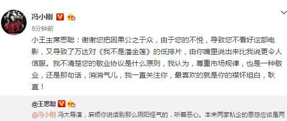 紧接着,冯小刚再度开炮表示王思聪的话比自己说的更令人信服,更谢谢王思聪把因果公之于众,“由于您的不悦,导致您不看好这部电影,又导致了万达对《我不是潘金莲》的低排片。