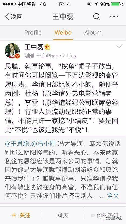 王思聪的“挖角说”还炸出了华谊掌门人之一的王中磊。虽然双方均表示了对各自挖“墙皮”的“不悦”。