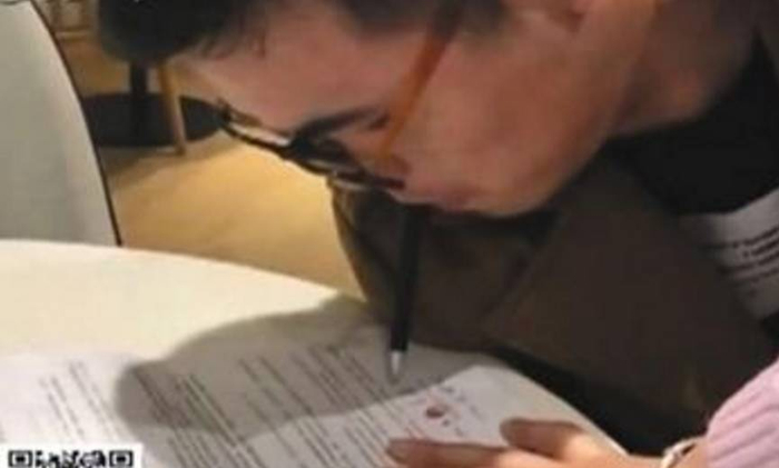 △11月17日,吴建平用嘴叼着笔,签订购房贷款合同,银行全程记录。