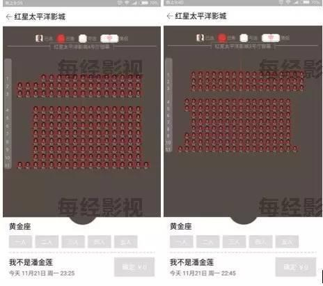据 格瓦拉数据显示,昨日福州红星太平洋影城22时45分和23时25分两个场次的《我不是潘金莲》全场座位都是“已选”状态;而猫眼数据中该场次却全是空 位。记者打电话询问该影城这两场电影是否都满场时,接听电话的工作人员却回应称,“这两个场次的《我不是潘金莲》今晚不演了。”