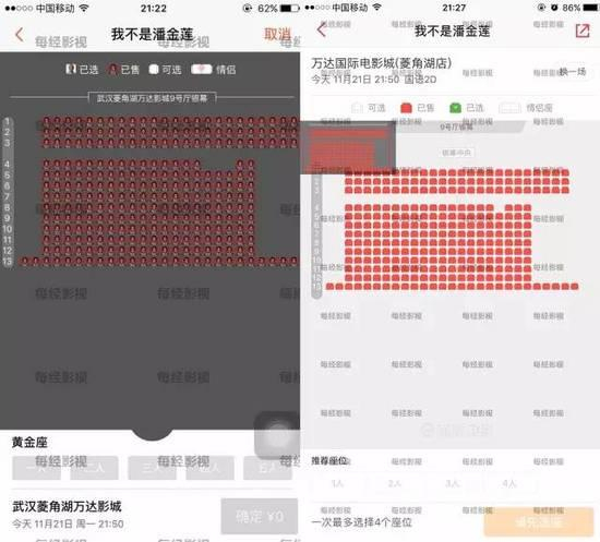 据猫眼显示,武汉万达国际电影城(菱角湖店)昨日21时50分的场次居然是全场满座,该场次一共有276个座位,在猫眼APP上显示的是全部被预定。与此同时,记者又在格瓦拉APP上看到这家影城的这场电影同样是满座的。