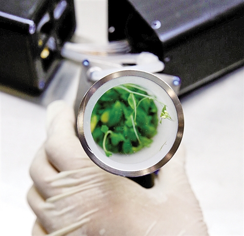 在中科院空间应用工程与技术中心,科研人员展示从太空返回并开花的拟南芥。