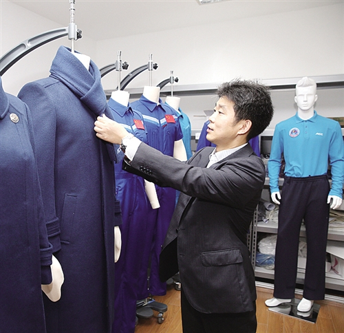 上海东华大学航天员服装研发设计团队负责人李俊教授在整理模特身上的航天员服装。