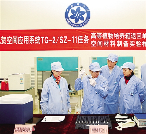 在中科院空间应用工程与技术中心,研究人员在检查空间材料制备样品外观状态。