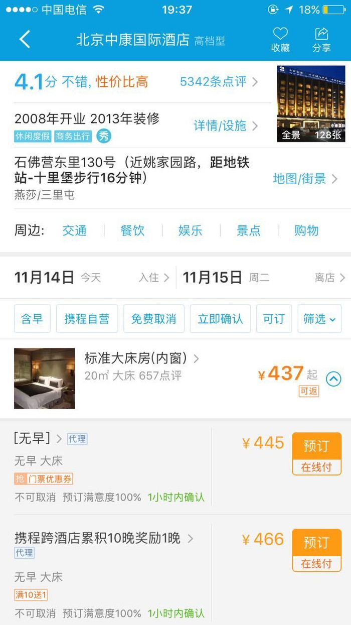 另外,“你再搜索一下北京福地皇城,酒店在东四,商圈却划到了王府井天安门,你看看差哪儿去了。”知情人士说到。“只要佣金高给携程的利益好,它都会帮忙改商圈,最主要的是携程的抓取规则和商圈划分现在成了行业的标准,携程起了一个非常不好的带头作用,这也可能导致了很多消费者明明想住在三里屯就可能去了石佛营,甚至出现找不到酒店的情况。”