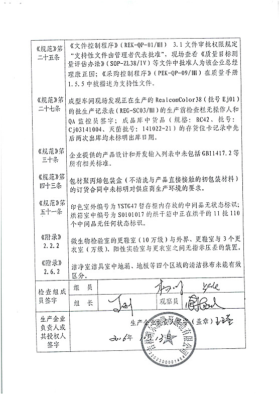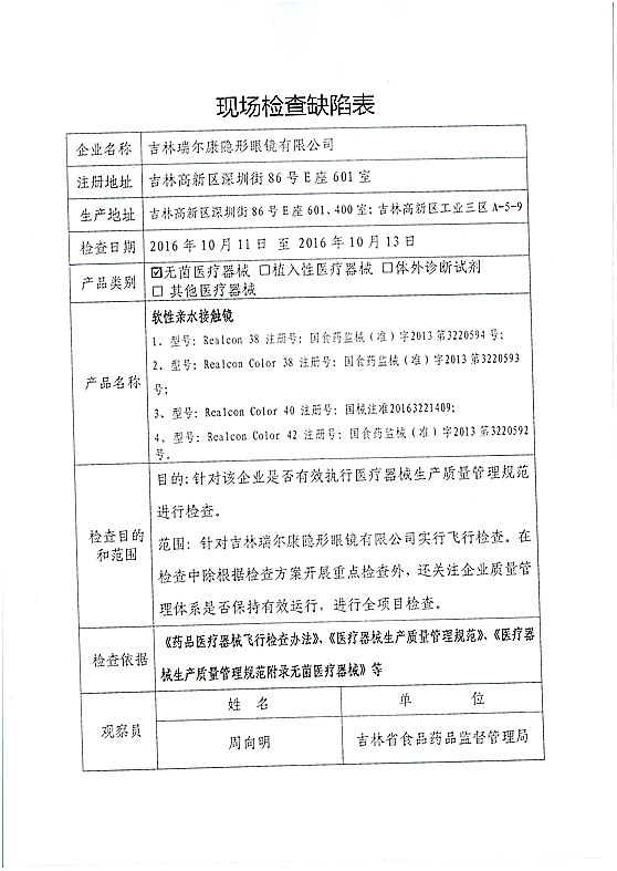 对吉林瑞尔康隐形眼镜有限公司飞行检查情况 食药监总局 2016.11.0216:08 关注 吉林瑞尔康隐形眼镜有限公司的以下行为(见下表)不符合医疗器械生产质量管理规范相关要求,质量管理体系存在缺陷。现由吉林省食品药品监督管理局责成吉林瑞尔康隐形眼镜有限公司对上述缺陷限期整改。
