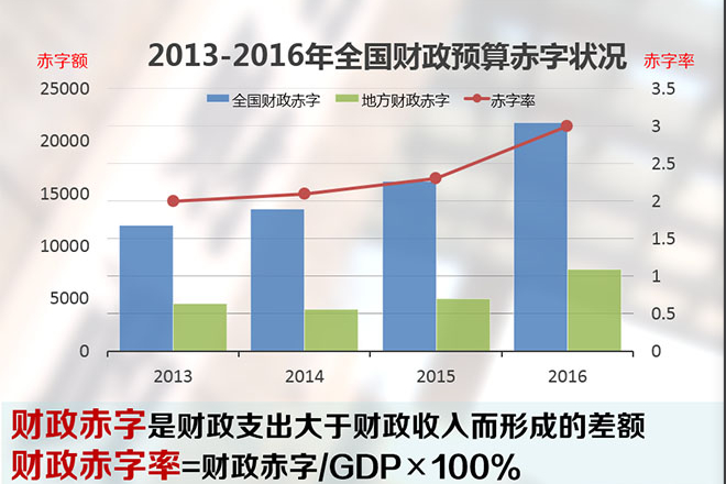 根据《关于2015年中央和地方预算执行情况与2016年中央和地方预算草案的报告》,2015年中国赤字规模为16200亿元(赤字率为2.4%),2016年这一规模拟扩大至21800亿元,赤字率为3%,为历史最高。