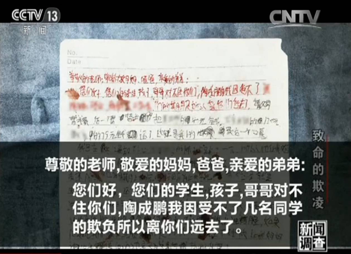 在整理孩子遗物的时候,家人意外发现了陶成鹏留下的三封遗书,其中一份遗书是写给老师、父母和弟弟的,在这份血迹斑斑的遗书上他写道:你们的学生、孩子、哥哥对不住你们,我因受不了几名同学的欺凌,所以选择离你们远去了。