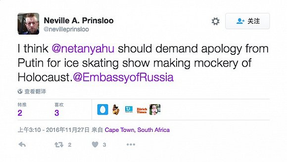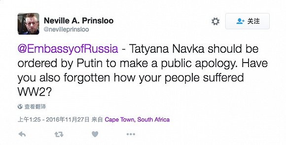 其他社交媒体平台也出现了类似的愤怒情绪。Facebook上有网友称“纳乌卡的行为下流”,推特上有一位来自南非的网友要求纳乌卡道歉,“普京应该下令让纳乌卡公开道歉,难道你忘了俄罗斯人在二战期间受到的伤害吗?”他甚至@以色列总统,要求普京也要对此表示道歉。