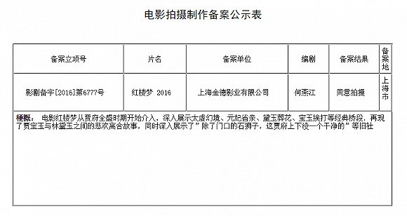 根据最新公布的电影备案信息,电影《孔子》编剧何燕江将创作新片《红楼梦 2016》的剧本。影片《红楼梦》从贾府全盛时期开始介入,深入展示太虚幻境、元妃省亲、黛玉葬花、宝玉挨打等经典桥段,再现了贾宝玉与林黛玉之间的悲欢离合故事,同时深入展示了“除了门口的石狮子,这贾府上下没一个干净的”旧社会。