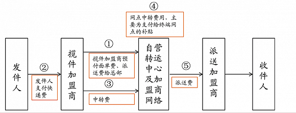 对加盟网点来说,主要收入来源是揽收费和派件网点给予的派送费。在中国快递业初期,揽件费归揽件网点,网点之间派送费互免。但这种模式下,西部地区收件少、发件多的地区网点无以为继,东西部利益分布不均,东部网点没人做。