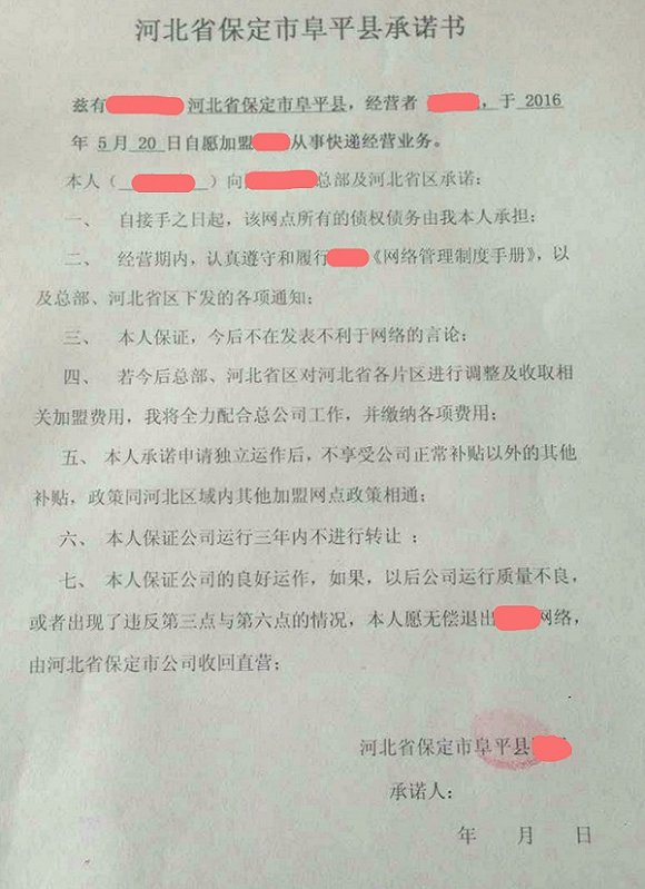 对于这样的处罚,被加盟协议绑架加盟商只能逆来顺受——怎么罚、罚多少完全由总部制定,并无任何监管部门。记者在一份某快递企业加盟商的承诺书中看到,加盟者必须承诺:“若今后总部对各片区进行调整及收取相关加盟费用,我将全力配合总公司工作,并缴纳各项费用”,并且保证:“今后不在发表不利于网络的言论”,如果违反这一条,“本人愿无偿退出,由市公司收回直营”,所以加盟商们是敢怒不敢言。