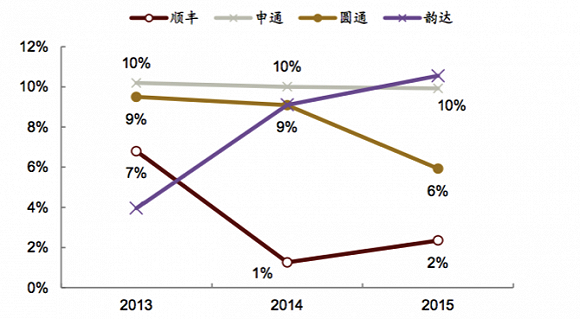 从业务增速来看,加盟制企业利用较少的资金快速拓展,业务量增速高2013-2015年,圆通、韵达和申通的快递业务量的复合增速分别为54%、35%和32%,而顺丰但公司传统国内快递业务的复合增速只有25%。