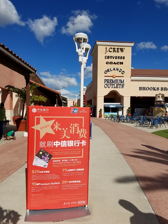 尽管奥兰多并非中国游客在美国的热门目的地,但这里的高端奥特莱斯由于名牌云集,也吸引了很多中国面孔。购物区到处都有中国商业银行信用卡的广告和额外促销活动,轻奢品牌门口的排队主力也是华人,广播除了英语和西班牙语,还增加了中文,很多中国游客喜爱的品牌也增加了提供中文服务的导购。