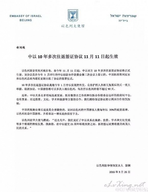 以色列自2016年11月11日起为因商务或个人旅游赴以、持普通护照的中国公民发放十年多次入境签证,签证类型B2。该签证不适用于以工作、学习、劳工家属探亲以及团体旅游为目的的签证申请。