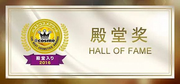殿堂奖是cosme大赏的最高荣誉,各部门第三次获得第一名的商品认定为殿堂级化妆品,简单来说就像获得了奥斯卡终身成就奖一般,是化妆品届的最佳主角。(殿堂奖不分排名先后)