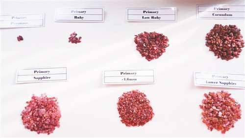 次生矿区内,肉眼所见只有红土,而在原生矿区,裸露的地面上嵌满宝石。大部分的宝石呈现微微的粉色,半个指甲盖大小,形状不一。深红色纯正红宝石较少。