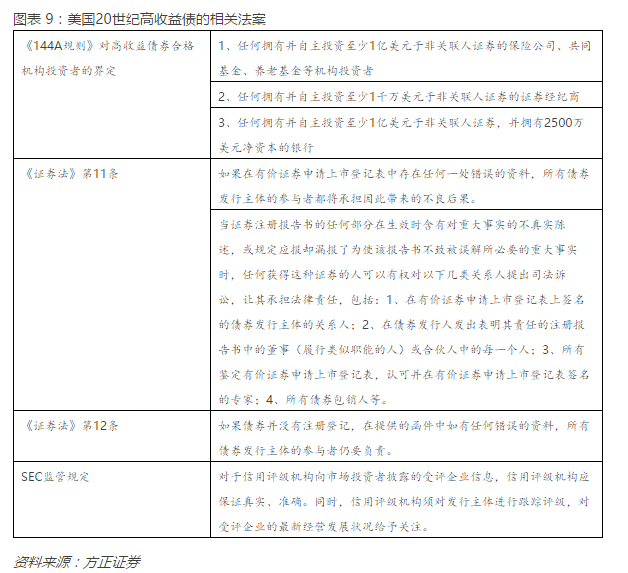 在当时美国对高收益债发行者的限制大致有两点:其一是高收益债的发行对象是被严格限制的,按照当时的法律,其只能对“不需要受强制信息披露制度保护并且‘自己可以照顾自己’的对象发行”。其二是发行人需要遵循证券法所规定的其他义务,尤其是“反欺诈法”(具体细节可见下表)。从这系列制度来看,并未有融资收购的禁行字眼,这在一定程度上也为米尔肯的高收益债融资收购形成了比较自由的制度基础。