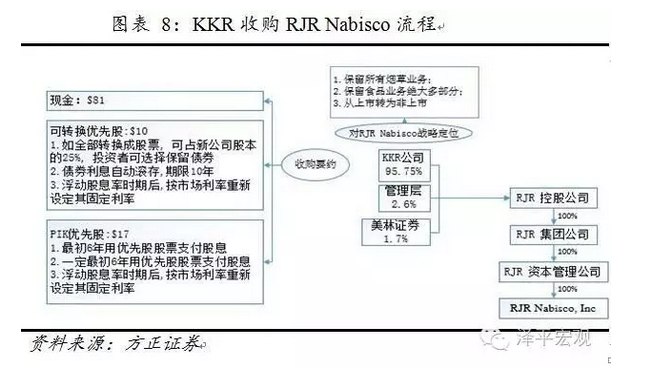KKR的成功收购,垃圾债的作用可谓功不可没,在总交易金额250亿美元中,KKR自身资金仅有1500万美元,仅占总金额的0.06%,其余资金几乎都是垃圾债券大王米尔肯发行垃圾债券筹得,杠杆之高,令人惊叹。
