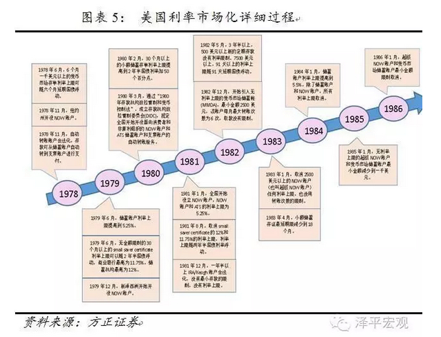 1978年,美联储规定银行发行6个月定期存款(CD),而其利率则受制于每周国债拍卖市场价格。虽然当时的CD产品存在最低限额的门槛,但存款机构的资金仍大量流入到这些监管较松的CD产品之中。其后,也在资金脱媒化的倒逼之下,美国陆续实施了“1980年存款机构放松管制以及货币控制法”、“1982年存款机构法”、“Q条例”等促成利率市场化的政策,逐步放松自动转账服务(ATS)账户、小额储蓄存单、NOW账户、货币市场储蓄账户的利率管制,直到1986年3月,客户存款利率管制被完全取消。