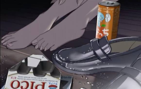 我们可以继续看看《言叶之庭》对脚的迷恋。孝雄逃课来到庭园。在一座安静的小亭子里偶遇了翘班的雪野百香里。她边吃巧克力边饮啤酒的样子引起了他的注意。