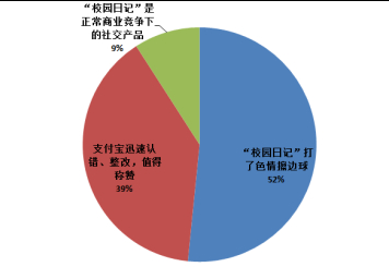 随机抽取486名网友的留言、评论,可以发现,超过5成网友质疑支付宝所推出的“校园日记”“白领日记”打了色情的擦边球,以低俗内容吸引用户,是挑战法律和道德双重底线的行为;对于支付宝官方认错道歉并下线相关功能的做法,近4成用户认为此番做法是负责任的,值得称赞;还有不到1成的网友发表评论认为,这也不过是一款陌生人社交产品而已,是正常的商业竞争。