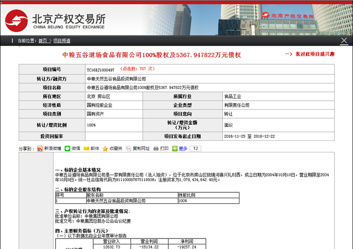 其实,早在今年8月份,中粮就在北京产权交易所挂出“中粮江西天然五谷食品有限公司”股权及债权的出售信息。以出售中粮五谷道场食品有限公司子公司的行动向外界传达出了“处置”五谷道场的决心。