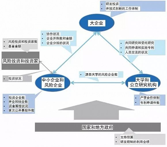 2016年7月,日本开放式创新协议会(JOIC)与日本新能源和产业技术综合开发机构(NEDO)合作发布了日本首部“开放式创新白皮书”。白皮书对日本开放式创新相关数据进行了处理和分析,以定量的形式显示日本开放式创新的现状。白皮书指出,与开放式创新相关的主体各式各样,主要择取四类具有代表性的主体(分别为:①大学和公共研究机构;②中小企业和风险企业;③大企业;④国家和地方政府),对上述各对象的状况及任意两者之间的合作状况进行了分析(详见图1)。