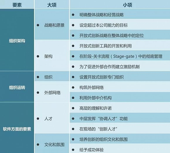 白皮书归纳总结了开放式创新若想取得成功的三大因素:一是战略和愿景等组织架构上的要素,二是发挥连接外部作用的组织运转,三是文化和氛围等软件方面的要素(详见表5)。