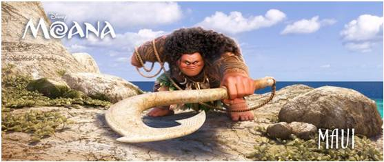 片中的毛伊(MAUI),原型是波利尼西亚神话中的一位广受爱戴的半人半神的英雄,喜欢开玩笑和恶作剧。