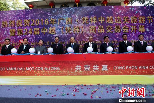 中新网凭祥12月11日电(记者 杨志雄 黄艳梅)2016年广西·凭祥中越边关旅游节暨第24届中越(凭祥)商品交易会11日开幕。来自中国与越南等东盟多国政商界人士会聚“中国南大门”广西凭祥市,围绕“一带一路、共荣共赢”主题,探讨推进中越旅游和商贸务实合作。