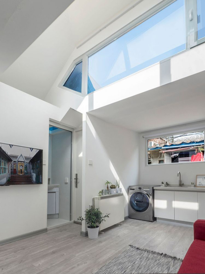 这间插件家是为患有幽闭恐惧症的小樊量身定做的:客厅比原来的平房高近一倍,顶部双侧都开了高窗,阳光能够铺洒在室内的每个角落。