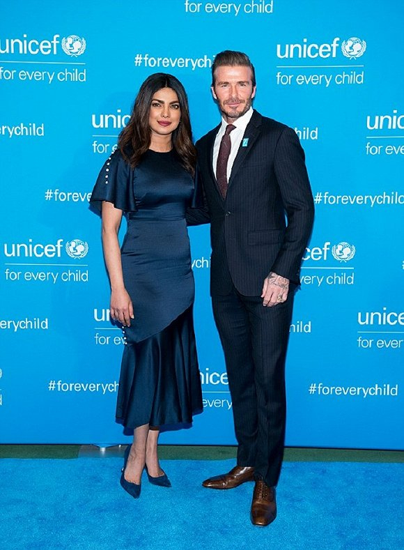 站在他身旁是印度演员朴雅卡·乔普拉(Priyanka Chopra),她与聚集在联合国总部大楼参与活动的众多人士一样取得了相当亮眼的成就。今年34岁的前印度小姐即将担任联合国儿童基金会亲善大使,当晚活动中,乔普拉身着普拉巴·高隆的梨形海军蓝色百褶鱼尾裙,苗条的身材在收紧的斜裁连衣裙衬托下展露无遗。