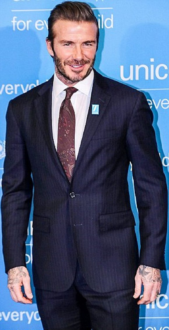 担任联合国儿童基金会亲善大使11年以来,贝克汉姆一直用别针装饰礼服为组织打广告。这次他照例梳了大背头,外披细条纹西装,搭配他的白衬衫和紫红色的领带,显得格外精神。